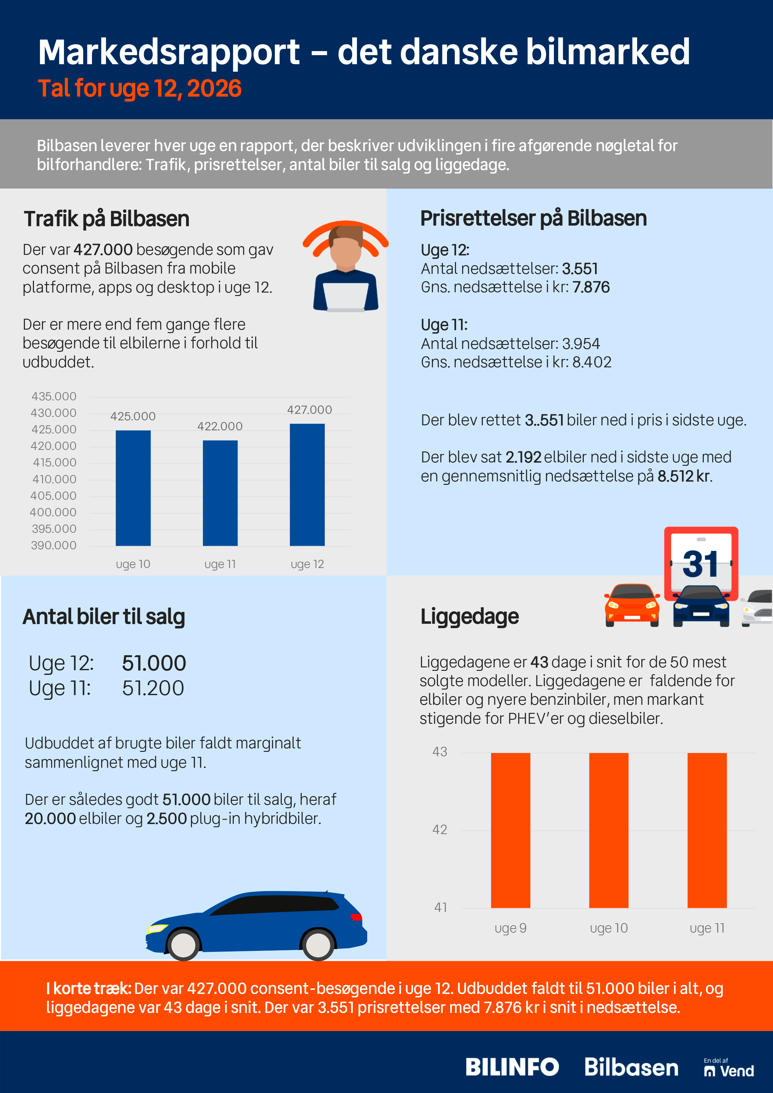 At der sælges mange biler i øjeblikket ses også på antallet af prisrettelser, der har været faldende i de seneste tre uger, og i uge 12 var det lige under 2.200 elbiler, der blev rettet ned i pris, det laveste antal prisrettelser siden uge 4.