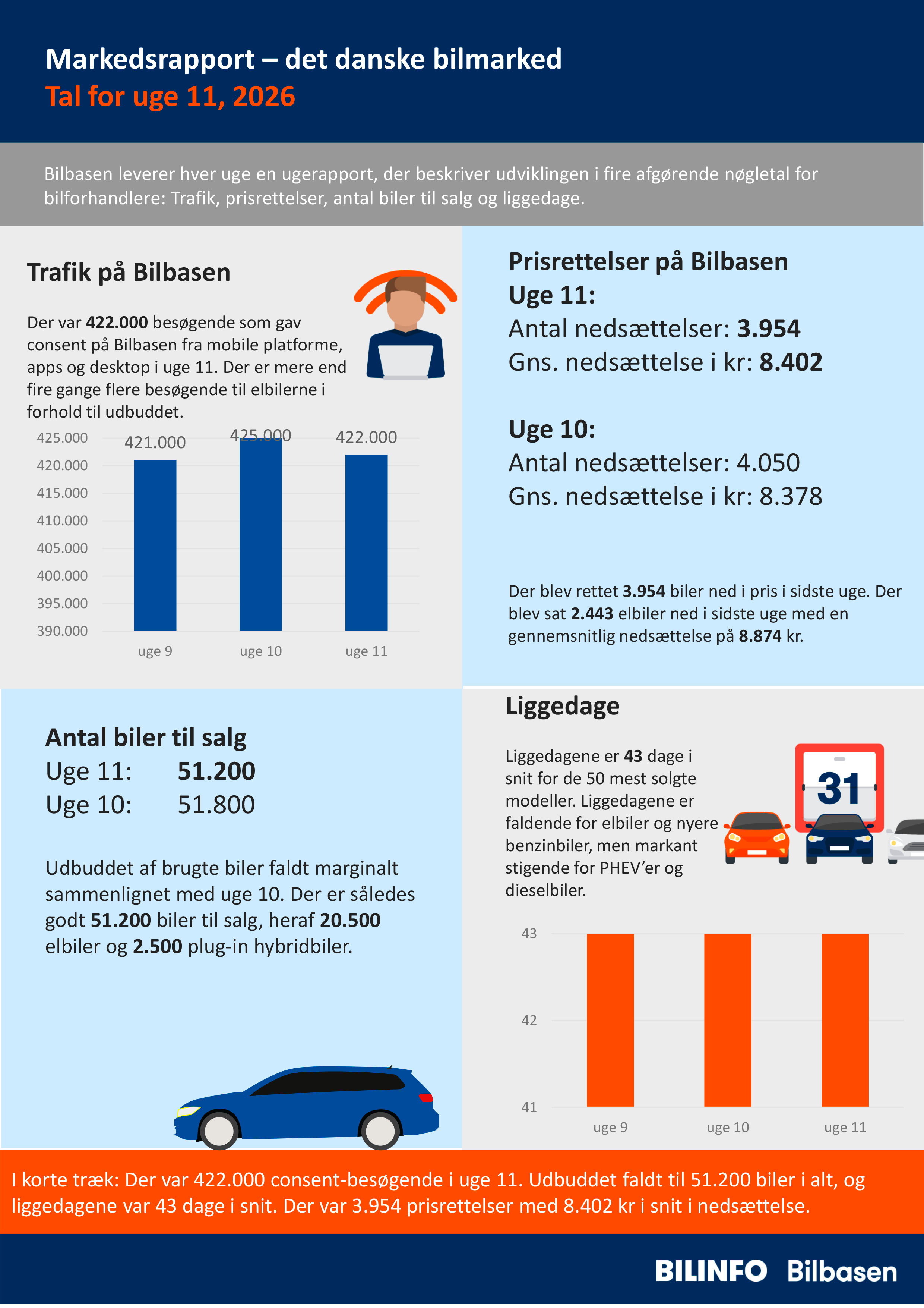 Udviklingen i de fire nøgletal i markedsrapporten følger tendenserne for de foregående uger i form af færre prisrettelser, højt antal besøgende, stabile liggedage og faldende udbud af brugte biler.